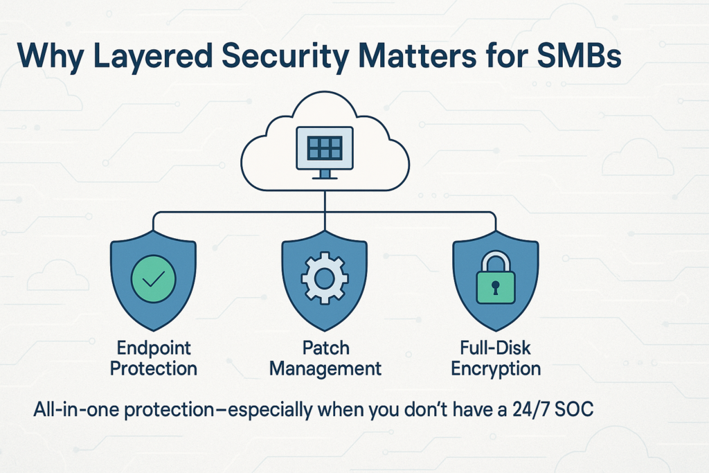 Most SMBs don’t have a 24×7 SOC, so layered defense matters. My go‑to bundle combines endpoint protection with easy patching and full‑disk encryption—all managed from one cloud console: